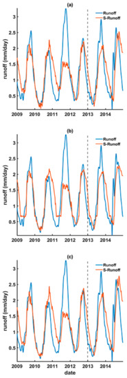 The reconstructed (during 2009–2012) and forecasted (during 2013–2014) runoff using the upstream GRACE land water storage (i.e., S-runoff) based on (a) linear regression, (b) ANN, and (c) LSTM models.