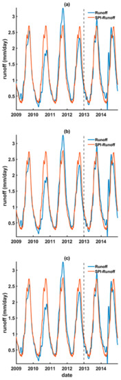 The reconstructed (during 2009–2012) and forecasted (during 2013–2014) runoff using the upstream TRMM SPI (i.e., SPI-runoff) based on (a) linear regression, (b) ANN, and (c) LSTM models.