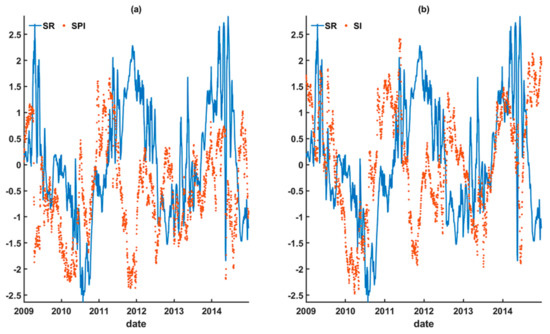 In the presence of the moderate (strong) El Niño (La Niña) event during 2009–2010 (2010–2011), apparent discrepancies in the peaks against the in situ runoff during 2010–2011 are still present, notwithstanding the reconstructed runoff based on SPI and SI. As a result, the time series of the SPI and SI at the upstream during 2009–2012 were examined against the in situ SR for further possible reasons (Figure 11).
