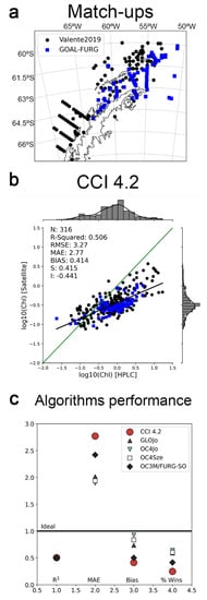 Match-ups’ locations and performance of the CCI 4.2 product. (a) Locations of the match-ups used in this work. The colour code indicates whether the in-situ Chl-a measurement was obtained from GOAL-FURG (blue) or extracted from the database published by [30] (black). (b) Comparison of the CCI 4.2. satellite Chl-a and in-situ Chl-a. Note that the scale is logarithmized (log10). The green line represents the 1:1 line (ideal correspondence). (c) Comparison between the performance of all the Chl-a products and algorithms used in this study. The thick black line corresponds to an ideal performance for each presented metric (% wins = 100%, MAE = 1, bias = 1 and R2 = 1). Thus, the closer to this line an algorithm is, the better its performance. Note that the MAE, bias and R2 cannot be negative. In the MAE and bias cases, this is due to the use of log10 Chl-a values when calculating these metrics. As such, both MAE = 1 and bias = 1 correspond to an actual value of 0 (no bias and no MAE).