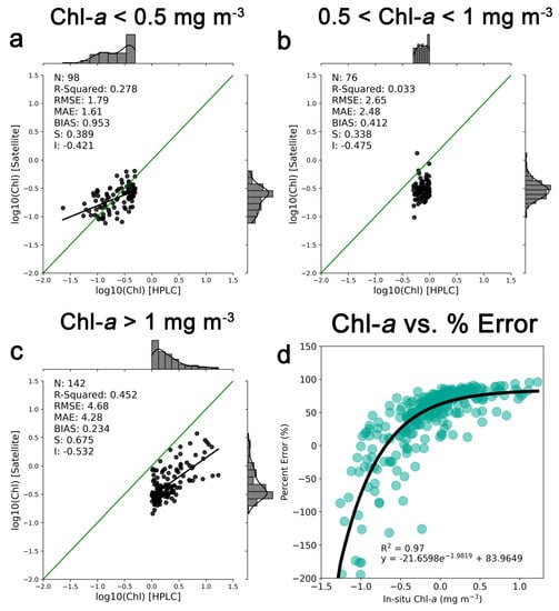 In spite of the observed general underperformance of the CCI 4.2 product, clear differences in performance were seen amongst match-ups in low Chl-a waters (<0.5 mg m−3; N = 98), intermediate Chl-a waters (0.5 mg m−3 ≤ Chl-a < 1 mg m−3; N = 76) and high Chl-a waters (≥1 mg m−3; N = 142) (Figure 3). For low Chl-a waters, the CCI 4.2. exhibited a still negative, yet almost negligible bias (0.95; −5%; Figure 3a), while for intermediate and high Chl-a waters, the bias increased significantly: 0.41 (−59%; Figure 3b) and 0.23 (−77%; Figure 3c), respectively. The MAE also increased with Chl-a concentration, as waters with low (high) Chl-a concentrations exhibited a MAE of 1.61 (4.28). Since nearly half (142) of the match-ups identified correspond to high Chl-a waters, it was deduced that the latter shape the overall performance of the CCI 4.2. A strong relationship between in-situ Chl-a concentrations and the percent error of the satellite measurement was also observed, as the two increased logarithmically up to 100% (two-fold underestimation) (Figure 3d; R2 = 0.97). The underestimation was mainly observed for waters with Chl-a concentrations higher than ~0.3 mg m−3 (equal to −0.5 in log10-scale; Figure 3d). The in-situ concentration of pheopigments (i.e., Chl-a degradation products) was seen to rarely exceed 15% of Chl-a. Divinyl-Chl-a (highly associated with Prochlorococcus), and was also only observed in fewer than 10 matchups and did not exceed 0.03 mg m−3. Therefore, the potential influence of these pigments on the satellite signal of Chl-a is negligible and these will not be further discussed in this work.