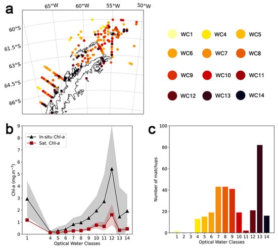(a) CCI 4.2 dominant optical water class distribution in the Western Antarctic Peninsula. (b) Mean and standard deviation (shaded area) of satellite (red) and in-situ (black) Chl-a (mg m−3) for each optical water class. (c) Number of match-ups identified per dominant optical water class.