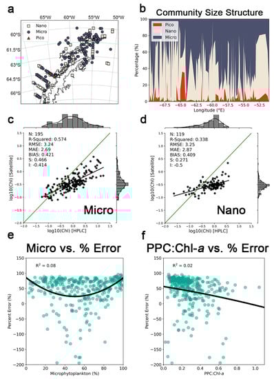 Top row: dominant phytoplankton size class (a) and pico-, nano- and microphytoplankton relative percentage (b) for the match-ups identified. Mid row: CCI 4.2 Chl-a product performance for match-ups dominated by microplankton (c) and nanoplankton (d). The green line represents the 1:1 line (ideal correspondence). Bottom row: relationship between the percent error (i.e., the percentage of the difference between in-situ Chl-a and satellite-derived Chl-a; %) and the percentage of microphytoplankton (e) and the ratio between the protective carotenoids and Chl-a (f).