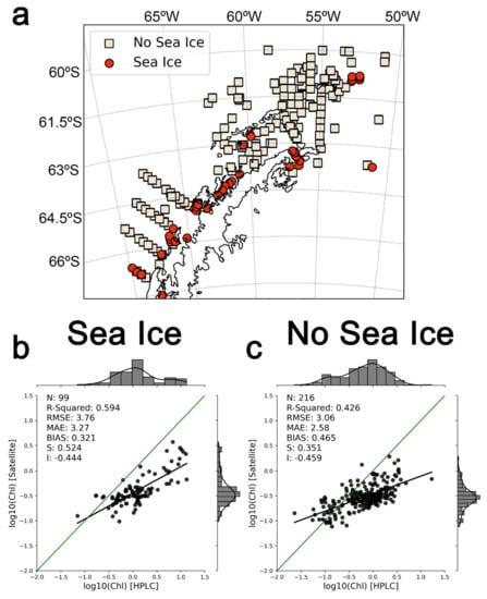 Regarding the potential effect of sea ice presence on the observed Chl-a underestimation, match-ups closer than 5 km to sea ice were observed to be linked to slightly higher bias (+14%) than match-ups with no nearby sea ice (Figure 6). This was reflected in a 66% decrease in the MAE (MAE = 2.58 for match-ups close to sea ice; MAE = 3.24 for the other match-ups), although the higher MAE for match-ups adjacent to sea ice could have also been affected by the difference in sample size. Overall, nearly a third of the match-ups (N = 99; 30%) were seen to be surrounded by sea ice up to 5 km of the in-situ collection site, most of them enclosed in the Gerlache Strait and in the Antarctic Sound, as well as off the Biscoe islands (see Figure 1 for location). When increasing this radius up to 20 km, the number of match-ups only increased slightly (N = 110), which yielded similar results (see Supplementary Figure S1).