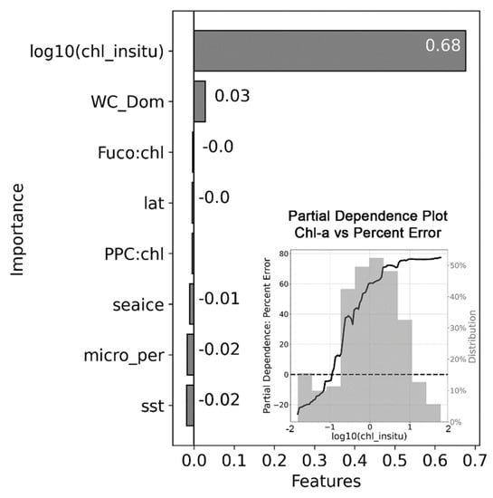 Results from the random forest analysis. Drop-column importance (i.e., how much each feature contributes to the out-of-bag error, a measure of accuracy of the model; the higher the out-of-bag error, the more accurate the predictions of the model) for each variable used in the model: Chl-a in log10 scale (chl_insitu), dominant water optical class (WC_Dom), Fuco:Chl-a, PPC:Chl-a, latitude (lat), sea ice presence, percentage of microphytoplankton (micro_per) and SST. The inset contains the partial dependence plot for the in-situ Chl-a concentration (i.e., the relationship predicted by the model between in-situ Chl-a and the percent error).