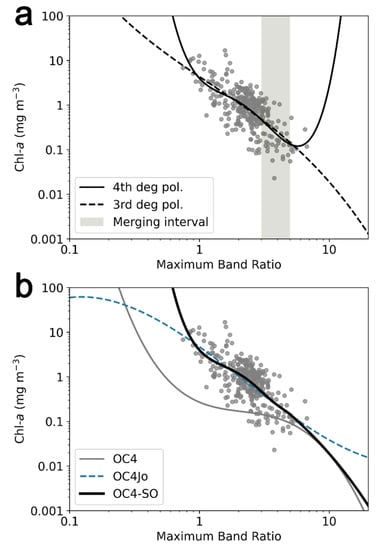 Relation between the in-situ Chl-a concentration and satellite maximum band ratio found for the match-ups in this study (N = 316). (a) Fitted 3rd- and 4th-degree polynomial functions that were used to derive the OC4-SO algorithm, along with the merging interval between MBR = 3 and MBR = 5, which was used to merge the two polynomial functions. (b) Comparison of the new algorithm (OC4-SO) and the regional OC4Jo. The global algorithm’s OC4 function [58] is also shown for comparison.