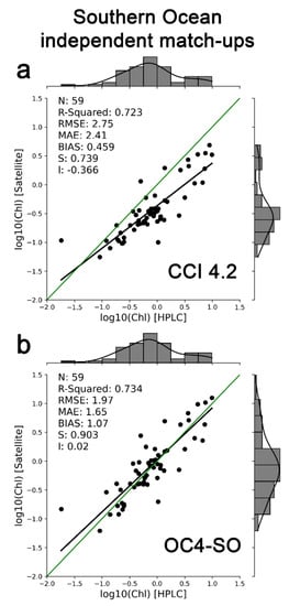 Comparison of the performance of the CCI v4.2 product (a) and the OC4-SO algorithm ((b); this work) for a set of independent match-ups from the Southern Ocean, excluding the Antarctic Peninsula. Note that the axis scale is logarithmic (log10). The green line represents the 1:1 line (ideal correspondence).