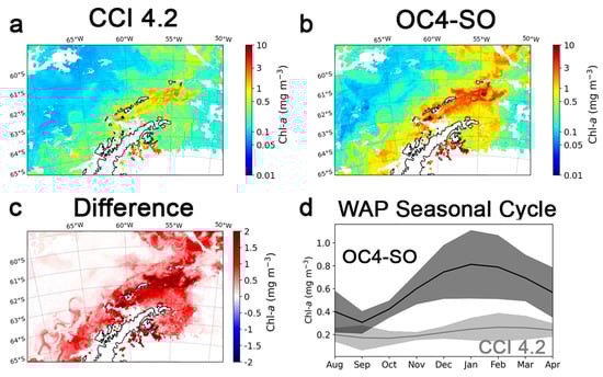 Satellite-derived Chl-a concentration for the Antarctic Peninsula on 2 March 2011, from CCI 4.2 (a) and using the OC4-SO algorithm (b), as well as their differences in terms of Chl-a concentrations (c). Comparison of the smoothed mean (lines) and standard deviation (shaded area) of the seasonal cycle between 1998 and 2019 (August to April), calculated using the weekly spatial average for the Western Antarctic Peninsula (WAP) between the Anvers and Elephant Island (d). Note that the period between May and July is not shown due to the lack of data in mid-winter.