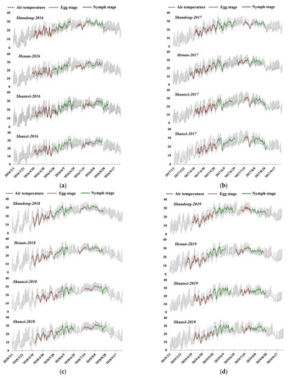 Based on climate reanalysis data, auxiliary data, and the DD model, we have simulated the locust development of each province (Figure 4). The results showed the egg stage in Shandong was from early-mid April to mid-late May and mid-July to early August, the nymph stage was from mid-late May to the end of June and early to late August. While the egg stage in Henan Province was from early April to mid-May and the beginning of July to late July, and the nymph stage was from mid-May to mid-late June and from late July to mid-late August. The egg stage of Shaanxi Province was between mid-April and late May, mid-July and early August, and the nymph stage was from late May to the end of June and early August to the beginning of September. The egg stage was between early-mid April and mid-late May, mid-July, and early August, and the nymph stage was from mid-late May to the end of June and early August to the end of August. The curves of the four provinces may indicate certain spatial differences in the development of locusts.