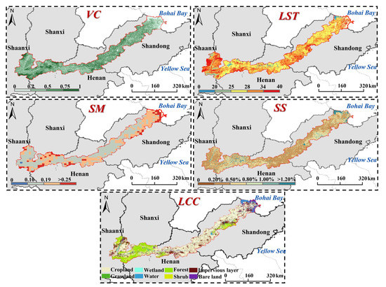 q is 1, 2, …, 5, and V 1 , p , … …, V 5 , p represent the values of LCC, VC, SS, SM, and LST, of patch p. V q , j , p is the qth habitat factor value of pixel j in patch p, and N p is the number of pixels contained in patch p.