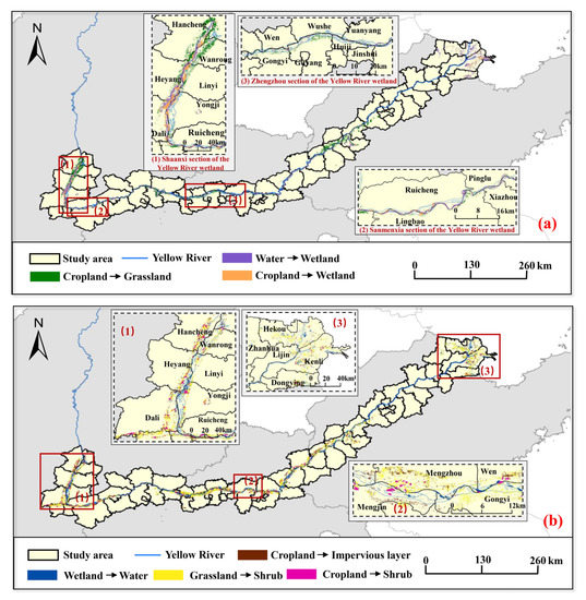 LCC directly affects the breeding and occurrence of locusts, and LCC also represents the joint influence of human and natural factors. Therefore, we plotted the transfer matrices of LCC corresponding to the increased and decreased locust areas from 2016 to 2020 (Table 4) to further analyze the driving factors of locust area evolution along the MLYR. The results showed that the conversion between wetland and water led to the change of locust area distribution. The area of water converted to wetland in the MLYR was larger than the area of wetland converted to water, which indicated that the Yellow River water discharge decreased in these five years. There might be two main reasons for the decrease in the water discharge of the Yellow River. One reason was the decrease in rainfall along the MLYR from 2016 to 2020. The other reason was the continuous reclamation of forests and swamps weakened the water storage capacity of the Yellow River, enhanced the continental climate, and reduced the flow of the Yellow River. The conversion of cropland to wetland would also lead to an increase in the regions of locust areas. Among them, the counties/cities/districts in Shaanxi and Henan Provinces where the areas of cropland converted into wetlands located were mostly the implemented areas for the wetland ecological protection policies and measures in the Yellow River Basin (Figure 9a). Wetlands are rich in animal and plant resources. However, human’ development and utilization of wetlands have greatly destroyed the wetland ecosystem, causing natural wetlands to face serious threats in China. Therefore, the wetland protection and restoration of the Yellow River basin has become an essential task. Since 2016, wetland reserves have been constructed, including the expansion of the Shaanxi section of the Yellow River wetland, the effective management of the Sanmenxia section of the Yellow River wetland, and the Zhengzhou Yellow River National Wetland Park constructed in the Zhengzhou section of the Yellow River wetland, resulting in the conversion of other LCCs into wetlands. In addition, the decreased locust areas due to the conversion of grassland and cropland to shrub (Figure 9b) might be caused by the changes of gramineous plants that locusts prefer to eat into planting peanuts, asparagus (Asparagus officinalis L.), and other plants that locusts do not like [8,65,66]. The areas where the cropland changes to the impervious layer were evenly distributed in this study area (Figure 9b), indicating that the urbanization process is accelerating in the provinces along the MLYR.