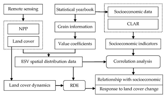 The research is carried out according to the following five aspects. (1) The planting area and yield of grain in the study area are obtained from the statistical yearbooks. Based on previous research [41], the value coefficients of each land cover type and each ecosystem service function type are determined. (2) The ESV is determined using land cover data and value coefficients and NPP reflecting the vegetation growth status is used to adjust the ESV spatial distribution. (3) By combining the statistical data and county-level administrative division data, the relevant indicators reflecting social and economic development are calculated. (4) Based on the method proposed in this study, the response degree of ESV to land cover change is analyzed. (5) Then the relationship between ESV and socioeconomic related parameters is then analyzed.