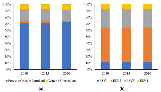 Proportions of ESV in the Dabie Mountain area in 2010, 2015, and 2020 according to (a) land cover types and (b) ecosystem service function types. ESV1: supply service, ESV2: regulation service, ESV3: support service, ESV4: cultural service.