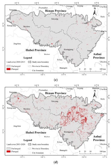 From 2010 to 2015 (Figure 5a), increases in ESV mainly occur in the middle of the study area. This is mainly due to the change in vegetation statuses, such as the increase in biomass, vegetation coverage, and other parameters. The areas with sharp increase and decrease (dark red and dark green) are scattered throughout the study area, and the changes are mainly due to the change in land cover (Figure 5c), such as the decrease of farmland and the increase in built-up land (Table 3).
