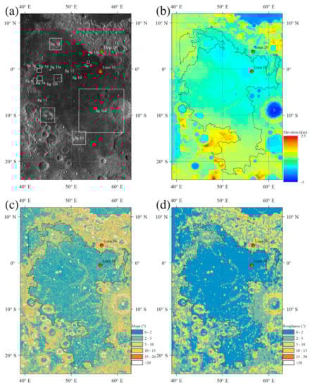 Mare Fecunditatis is located in the low-latitude area on the eastern nearside of the Moon, covering an area of ~310,000 km2 (Figure 1 and Figure 2a). SELENE and LRO DEM 2015 (SLDEM2015, 60 m/pixel, [26]) data show that Mare Fecunditatis has a higher elevation in the southwest and a lower elevation in the northeast, and the elevation of 99% of Mare Fecunditatis varies from −0.3 km to −2.7 km (Figure 2b). The peak ring of the Mare Fecunditatis basin is strongly degraded, and the outline is difficult to distinguish [27]. The slope in the basin interior is relatively gentle (average slope of 3.56°); more than 99% of the area has a slope of less than 20°, and 84% of the area has a slope of less than 5° (Figure 2c). Roughness [28] based on the median slope of the 57 m-baseline Lunar Orbiter Laser Altimeter (LOLA, [29,30]) data shows an average value is 1.7°, while the roughness of more than 90% of the area is less than 2.6° (Figure 2d). Mare Fecunditatis is relatively flat, and only crater rims appear with large roughness.