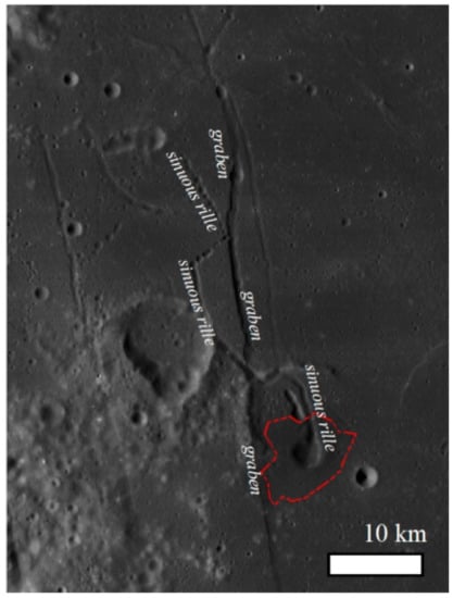 In addition to the sinuous rilles and floor fractures, the tectonic movement also forms long and narrow grooves, including arcuate rilles and grabens (straight rilles) (Figure 6). Arcuate rilles are usually on the edge of the lunar mare with smooth curves [90]. The graben (straight rilles) forms under the extensional stresses, and a block of the crust cracks and drops down to create the valley floor [91,92,93].