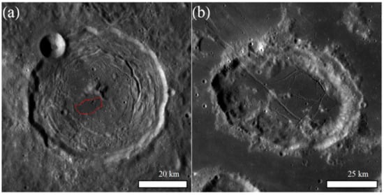 The Taruntius crater (5.5° N, 46.5° E, Figure 7a) and Goclenius crater (10.0° S, 45.0° E, Figure 7b) are found in the northern and western part of the Mare Fecunditatis, respectively. Their floors are cut by concentric or polygonal fractures, known as floor-fractured craters (FFCs) [35,55,56]. There are two formation hypotheses for FFCs: (1) viscous relaxation, wherein the crater floor rebounds to fill the crater at a rate controlled by the subsurface viscosity structure, resulting in an overall amplitude shallowing of long-wavelength crater topography [57]; and (2) magma intrusions and sills form beneath the crater, and the magma lifting produces the laccolith and fractures the overlying the crater floor [35,55,56,58]. Recent numerical simulations do not support the viscous relaxation hypothesis [59], but high-resolution topographic and gravity data advocate the magma intrusion hypothesis [35,55,56].