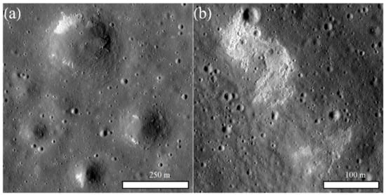 Two sites of IMP in Mare Fecunditatis, shown with Narrow Angle Camera (NAC, [13]) images. (a) IMPs next to the crater rim (2.02° S, 43.31° E); (b) IMPs on the mare (0.09° N, 42.41° E). Data source: NAC M1230441915RE and NAC M150239673LE.