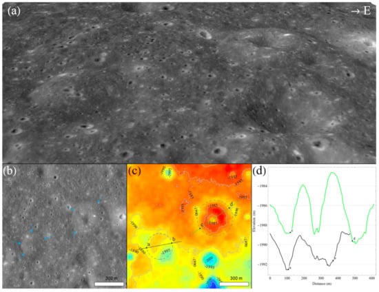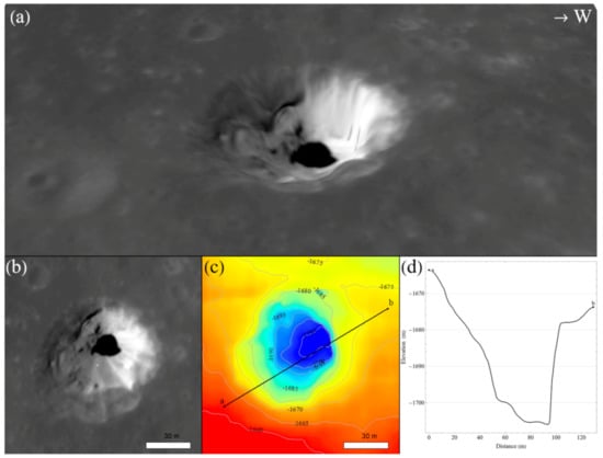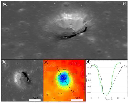 Pit crater (6.752° S, 42.759° E) on the west of Fecunditatis. (a) 3D image (real elevation values are used); (b) NAC orthoimage; (c) NAC DTM; (d) elevation of the profiles of (c). Data source: NAC M1100931431LE and NAC M1120953701RE.