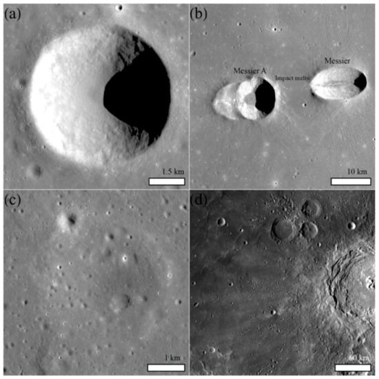 Different types of craters in Mare Fecunditatis. (a) A simple crater (0.2° S, 45.5° E), shown with a TC image; (b) Messier (1.9° S, 47.7° E), Messier A (1.97° S, 46.95° E), and smooth impact melts, shown with a TC image; (c) a buried crater (3.10° N, 53.78° E), shown with a TC image; (d) crater chains on the south of Langrenus (8.8° S, 61.2° E), shown with a WAC image.