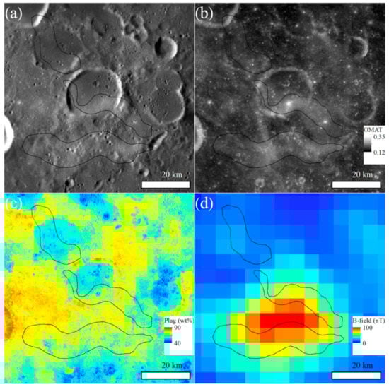 There are three swirls (Figure 14, identified by [19]) on the highland at the southwest side of Mare Fecunditatis with a low optical maturity (OMAT, Figure 14b, [40]), and the surface vector mapping (SVM, [114]) of magnetic field (B-flied) shows this area has a magnitude of up to 100 nT (Figure 14d). The MI mineral data (Figure 14c, [40]) of the swirl show consistent plagioclase with the surrounding area, which contradicts hypothesis (3).