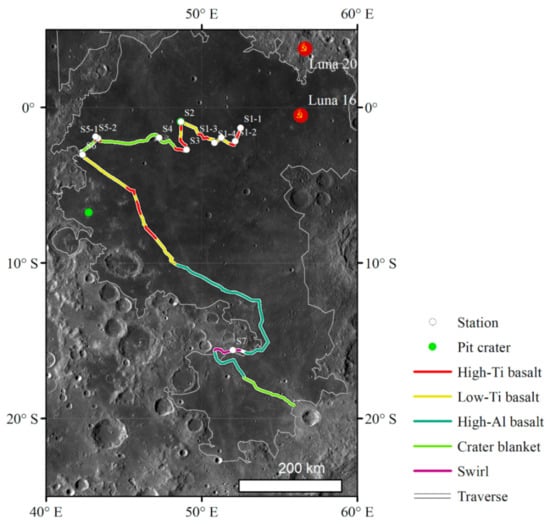 The Soviet Union, United States, Europe, China, Japan, and India have successively conducted their lunar robotic or crewed missions since the 1960s. Extraordinary scientific discoveries have been made, but even more questions have been proposed, including (1) bombardment history, (2) lunar interior, (3) crust and regolith, (4) polar region and volatiles, (5) volcanism and thermal evolution, (6) impact process, and (7) space weathering [1], and more scientific landing sites across the Moon have been proposed (e.g., [2,3,4,5,6,7]). However, different high-value targets are distributed all over the Moon and are normally far away from each other (Figure 1). The short detection distance (less than 39 km, made by Lunokhod 2 in 1973) of previous missions limited the complete scientific documentation of the investigation area, and exploring multiple sites in large distance at one mission was impossible in the era. With the development of technologies, multi-target long-distance missions [8,9] in the near future may become reality. The Intrepid mission [8] concept is one of the examples. The designed rover plans to travel ~1800 km in the Oceanus Procellarum in a 4-year period, which will explore Reiner Gamma, Marius Hills, young mare basalts, Aristarchus Plateau, Aristarchus Crater, and irregular mare patches (IMPs). Both 4 and 1.2 billion years of volcanic activity on the Moon could be revealed by Intrepid. The long travel distance would make the scientific outcomes several times larger than a normal rover mission.