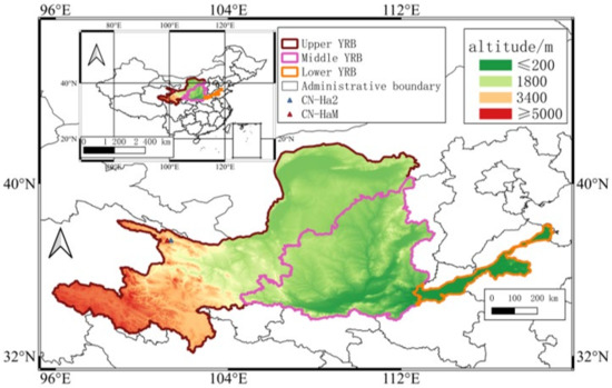 Along the total length of approximately 5464 km, the YRB is commonly separated into the upper YRB, the middle YRB, and the lower YRB (Figure 2). The Yellow River runs through nine provinces/autonomous regions in China, most of which belong to continental monsoon climate and are arid, semi-arid, semi-humid, and humid climatic regions [21]. The annual average air temperature in the YRB varies from −4 to 4 °C, and the average yearly precipitation is about 123~1021 mm, with great temporal rainfall variation both within and across years.