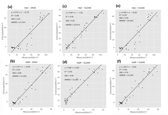 Scatter plots of observations and estimations of latent heat flux using MEP methodology (ERA5: (a,b); GLDAS: (c,d); FLDAS: (e,f)).