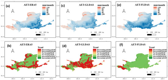 Spatial distribution (a–e) and trends (b–f) of monthly mean values of actual ET in the YRB with three different input data sources, ERA5: (a,b); GLDAS: (c,d); FLDAS: (e,f).