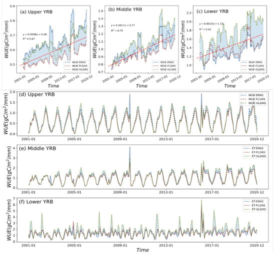 The annual (a–c) and monthly (d–f) variations in the mean WUE with three different data sources (ERA5, GLDAS, and FLDAS) in sub-basins of the YRB; Upper YRB: (a,d); Middle YRB: (b,e); Lower YRB: (c,f).