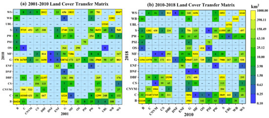 The land cover transfer matrix in the Yellow River Basin for 2001–2010 (a) and 2010–2018 (b).