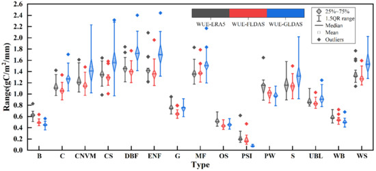 As indicated by the range of WUE values in Figure 9, it appears that the estimations of WUE values obtained by inputting GLDAS for a specific land use type have larger ranges. The ranges in Figure 9 and the land cover transfer matrix shown in Figure 8 indicate the linkage between WUE variations and land-use changes. It should be noted that the “CNVM” (Cropland/Natural Vegetation Mosaics) and “S” (Savannas) had large variations in both WUE, especially WUE-GLDAS, and land-use changes, which may indicate large water resource variations in the YRB. This result is confirmed by the presentation of the complicated variations in WUE values in the YRB and northwestern regions of China by Zhu et al. [8].