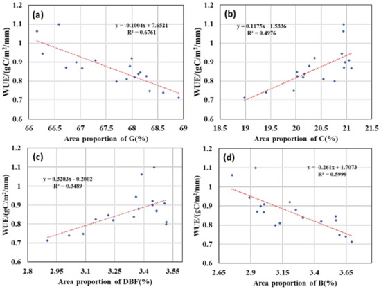 Relationship between four different land cover types and Water Use Efficiency (WUE) in the YRB: (a) Grasslands (G); (b) Croplands (C); (c) Deciduous Broadleaf Forests (DBF); (d) Barren (B).