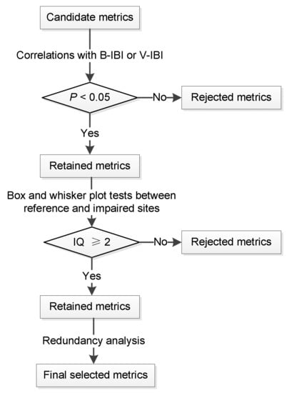 - Stoddard, J.L.; Herlihy, A.T.; Peck, D.V.; Hughes, R.M.; Whittier, T.R.; Tarquinio, E. A process for creating multimetric indices for large-scale aquatic surveys. J. N. Am. Benthol. Soc. 2008, 27, 878–891. [Google Scholar] [CrossRef]
