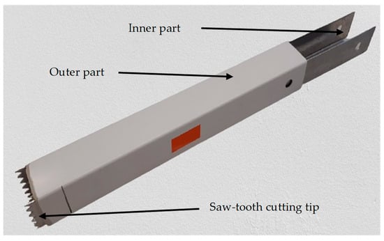 The portable rectangular snow corer was designed and built by the INRS’s remote sensing team and is shown in Figure 2. It is used to recover the vertical stratigraphy of the snowpack which allows measuring of the physical and optical properties of the recovered profile. The dimensions of the corer make it possible to recover the entire vertical profile of the snowpack because of its simple operating principle. The corer is made up of two parts, the inner part is made of metal and the outer part of plastic, with a triangular saw-tooth cutting tip. The device is simply inserted into the snow at the required depth. A trench is then made to access the lower part of the corer and a plate is placed under to prevent the snow from falling. The corer is then tilted horizontally and transported to the measurement station. At this point, the handle is pulled and the inner part containing the snow is carefully removed. The snow is only minimally disturbed during the sampling process, resulting in accurate measurements.