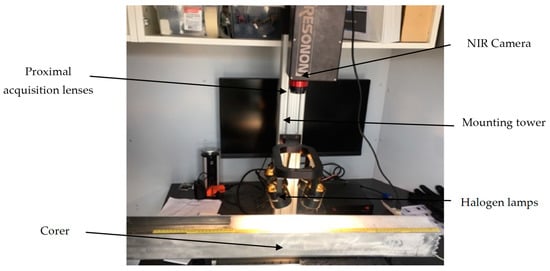 The proximal acquisition station used in this work consists of a RESONON PIKA NIR line-scanning hyperspectral camera that allows for the measurement of NIR spectral reflectance at several wavelengths between 900 and 1700 nm, with a spectral resolution of 5.5 nm and 148 spectral bands. The reflectance was calculated by measuring the radiance reflected from the snow surface and from a reference target. The latter has near-Lambertian reflection properties when viewed from the nadir. The station is also equipped with a halogen lighting system, mounting tower, linear translation stage for rapid image acquisition, data acquisition software (Spectronon Pro (Resonon Inc., Bozeman, MT, USA)) and proximal acquisition lenses, as shown in Figure 3.