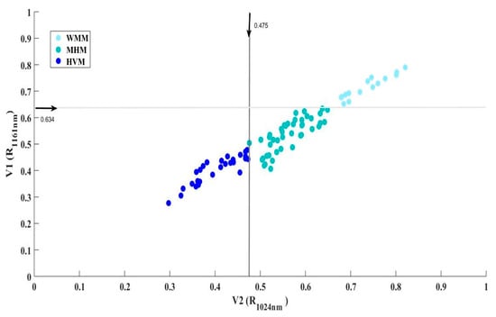 Density class determination using the hybrid model. The light blue, the marine blue, and the dark blue dots indicate the WMM, MHM, and HVM classes, respectively, and represent the calibration database used to calibrate the corresponding estimators. The grey lines are the two discrimination thresholds used based on wavelengths V1 (1161 nm) and V2 (1024 nm).