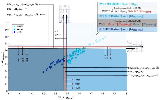 The two-dimensional GQF scheme using variables V1 and V2 and its application to calibrate the EBS. The black, red, and blue lines represent the optimal thresholds (lower, nominal, and upper, respectively) for V1 (OTV1L = 0.632, OT1N = 0.648 and OTV1U = 0.664) and V2 (OTV2L = 0.468, OTV2N = 0.480 and OTV2U = 0.492). k (1–3) and p (1–3) are the indices of the optimal thresholds associated with V1 and V2. The light blue, marine blue, and dark blue points represent the data used for training (WMM, MHM, and HVM, respectively) to calibrate the specific estimators. At the top right is the flow chart of the simplified EBS operational mode. The light blue, marine blue, and dark blue boxes designate the areas with WMM, MHM, and HVM classes, respectively. The overlapping areas in light and dark grey indicate the transitions between low-moderate and moderate-high densities, respectively. The terms of the equations are detailed in Equation (6). A detailed flow chart is presented in Appendix B.