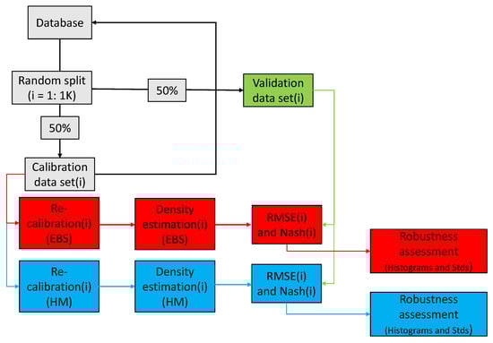 Twenty-five percent of the data was systematically selected from the initial database before proceeding to the EBS calibration (every fourth value was selected and set aside starting with low density values). This technique is called systematic split validation. The remaining data were used to calibrate the models by combining an ensemble-based classifier using CART with a multivariate stepwise regression based on fifteen specific estimators. The two models developed were subjected to a robustness test using the k-fold cross-validation method with 1K iterations. The latter is an iterative method (1K times) of random sampling by discount (50% of the data used for calibration and 50% for testing). The k-fold cross-validation approach is summarized in the flow chart in Figure 6.