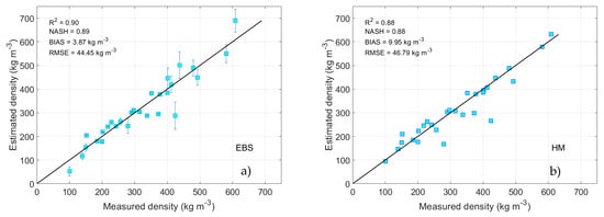 The validation technique used to assess the performance of our approach was based on the use of an independent database. The results of the validation with the independent database were satisfactory, with NASH = 0.89 and R2 = 0.90, despite some relatively low-density values (90–120 kg m−3). However, the validation process showcased that the EBS underestimated density values. Since this is a systematic error, it could be corrected during the modelling process.