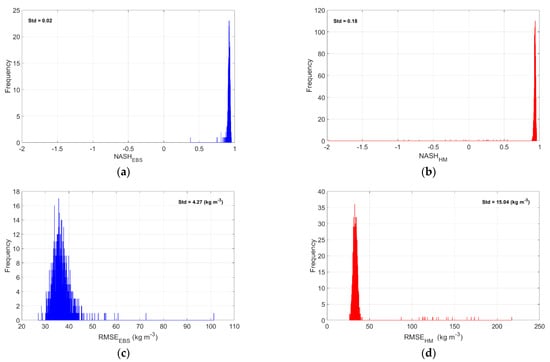 Histograms showing the robustness test between EBS and HM: (a) standard deviation (NASHEBS) = 0.02, (b) standard deviation (NASHHM) = 0.18, (c) standard deviation (RMSEEBS) = 4.27 kg m−3, (d) standard deviation (RMSEHM) = 16.04 kg m−3.