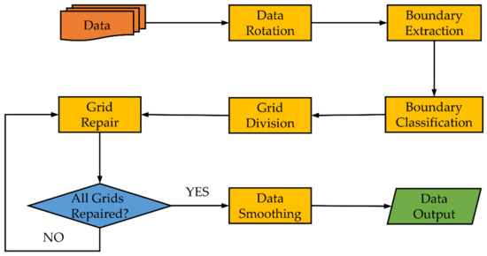 The technical flow chart of the “fuzzy” repair method proposed in this paper is shown in Figure 1. First, we rotated the pre-processed point cloud data to make the facade parallel to the plane XOZ. This step can make subsequent processing more convenient. For example, we only need to consider the X-axis and Z-axis when extracting the boundaries. After that, in the process of boundary extraction, we mainly extracted the feature boundaries representing the building structure (wall, door, and window boundaries). Furthermore, we used the boundary classification method proposed in this paper to divide the feature boundaries into horizontal and vertical feature boundaries. Finally, we carried out grid division and repair according to the extracted boundaries. The division and repair method will be described in detail later. When all grids were repaired, we output the final repair result through point cloud smoothing.