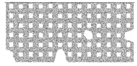 Data 4 [28] shows the point cloud of a building facade cut in a block of Paris, France, of the public dataset of IQmulus & TerraMobilita Contest, which was obtained by a vehicle-borne laser scanner. Due to the angle limitations of the scanner and the occlusion of a car, there is large data loss in the upper and lower areas. A picture of Data 4 [28] is shown in Figure 7.