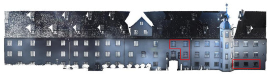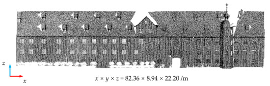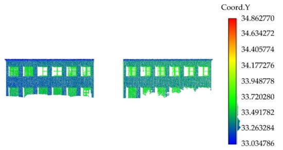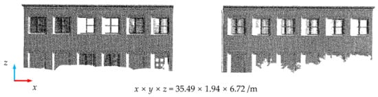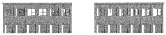 Data 2 and Data 3 are facade point clouds of the building in the Semantic 3D public dataset, with the TLS collected. The point cloud density was relatively high. To reduce the load on the computer, we subsampled them in this study (this step is not necessary). Data 2 and Data 3 are shown after subsampling in Figure 5 and Figure 6, respectively. The loss of the two kinds of point clouds was mainly generated at the bottom, caused by the occlusion of vehicles and flower beds.