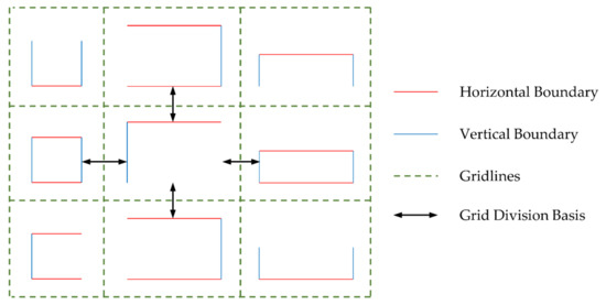 - In the horizontal direction, the two adjacent grids are based on the boundary of two adjacent windows (doors) on the left and on the right, and half of the boundary distance between the two adjacent windows (doors) is taken as the division;