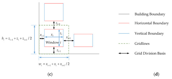 - When i is the upper or lower boundary window, its width is set to , its height to , and its grid width w to . If the distance between i and the bottom of the building is , and the distance between i and the upper window is , then the grid height h of i is . When i is the left or right boundary window, the grid-division is similar to the upper and lower boundary windows, with the grid width w is , and the grid height h is ;