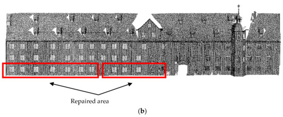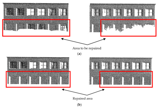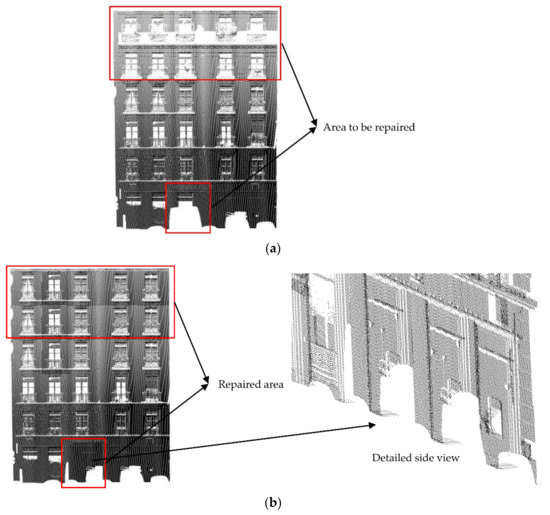 The repair results of Data 4 [28] (the original data was obtained from the public data set of the “IQmulus & TerraMobilita Contest”): (a) Before repair; (b) After repair.