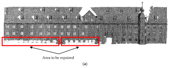 The reliability and accuracy of facade models derived from the measured data depend on data quality in terms of coverage, resolution, and accuracy. Facade areas with little or inaccurate three-dimensional (3D) information cannot be reconstructed at all, or they require considerable manual pre- or post-processing. Although there are some point cloud hole repair methods that consider the distribution regularity of a building, there are many manual interventions, mainly human–computer interaction. No repair principle applies to most point cloud data. For example, Luo et al. [26] proposed a fast algorithm for repairing and completing point cloud holes. However, manual intervention was needed to obtain the distribution regularity of the building facade. Becker et al. [27] proposed a quality-related building facade reconstruction method, which can be used for building facade point cloud with no or limited data. However, this method needs to integrate high-resolution images to construct the facade grammar, placing requirements regarding the quality of the image data.