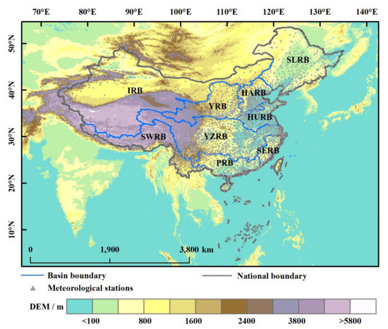 Meteorological stations, topographical features, and locations of the nine basin sub-regions, i.e., the Songliao River Basin (SLRB), Hai River Basin (HARB), Huai River Basin (HURB), Yellow River Basin (YRB), Inland River Basin (IRB), Yangtze River Basin (YZRB), Pearl River Basin (PRB), Southeast River Basin (SERB), and Southwest River Basin (SWRB). Data were from the Resource and Environment Data Center, Chinese Academy of Sciences.