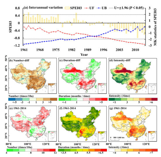 (a) Mutation test results of annual mean SPEI03 sequences. The UB, UF, and the 0.05 confidence level (U = ±1.96, p < 0.05) were plotted. The annual mean number of droughts, mean DD, and mean DI were calculated using SPEI03 for different periods. (b–d) show the spatial patterns of differences in the drought number, DD, and DI, respectively, from 1961–1994 and 1995–2014. (e–g) show the spatial patterns of the DF, DD, and DI from 1961–2014.
